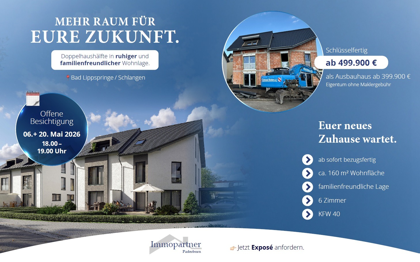Wir begleiten Sie auf dem Weg zu Ihrer eigenen Immobilie in Paderborn, Höxter, Detmold, Bielefeld und Umgebung. Vom ersten Tag Ihrer Suche bis zur Schlüsselübergabe stehen wir an Ihrer Seite. Aber auch bei dem Verkauf Ihres Eigenheims oder Ihrer Wohnung stehen wir beratend zur Seite und unterstützen Sie hierbei.