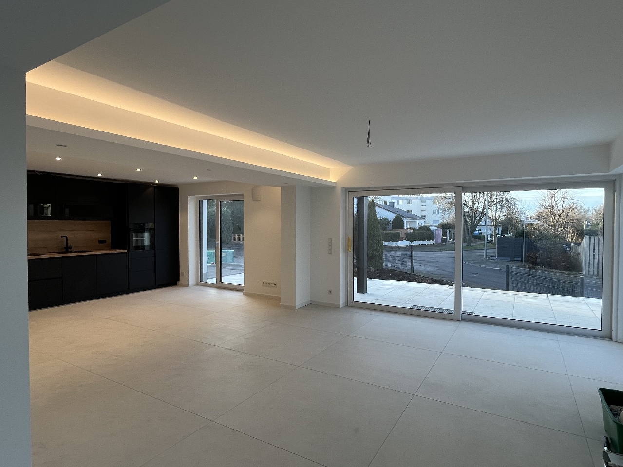 Das Herzstück der Wohnung ist der weitläufige Wohnbereich mit offener Küche, der dank großer Fensterfronten lichtdurchflutet ist und direkt auf die großzügige West-Terrasse führt, perfekt für Sonnenuntergänge und gemütliche Abende im Freien.
