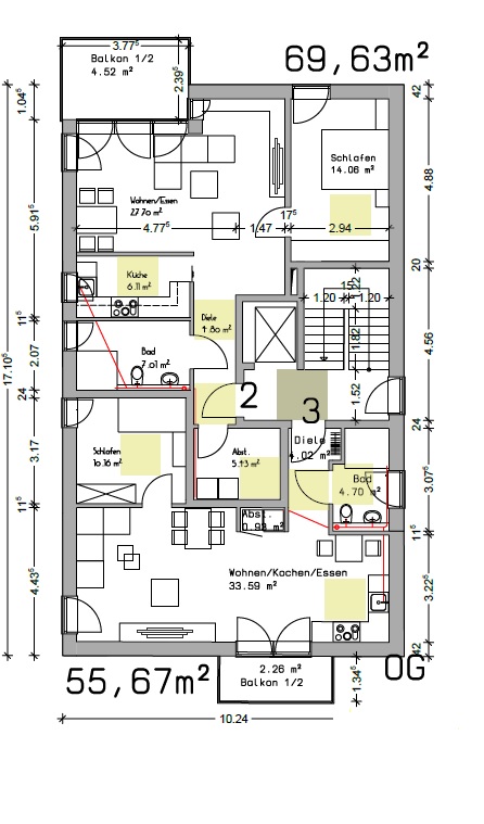 die Wohnungen in den oberen Geschossen sind durch den Aufzug barrierefrei zu erreichen und erhalten je einen schönen Balkon.