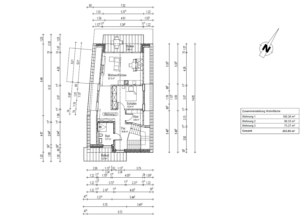 Das Haus umfasst 3 komfortable Wohnungen mit Wohnflächen von 73 und 100 Quadratmetern zu denen jeweils ein Carport und einen Abstellschuppen im Außenbereich