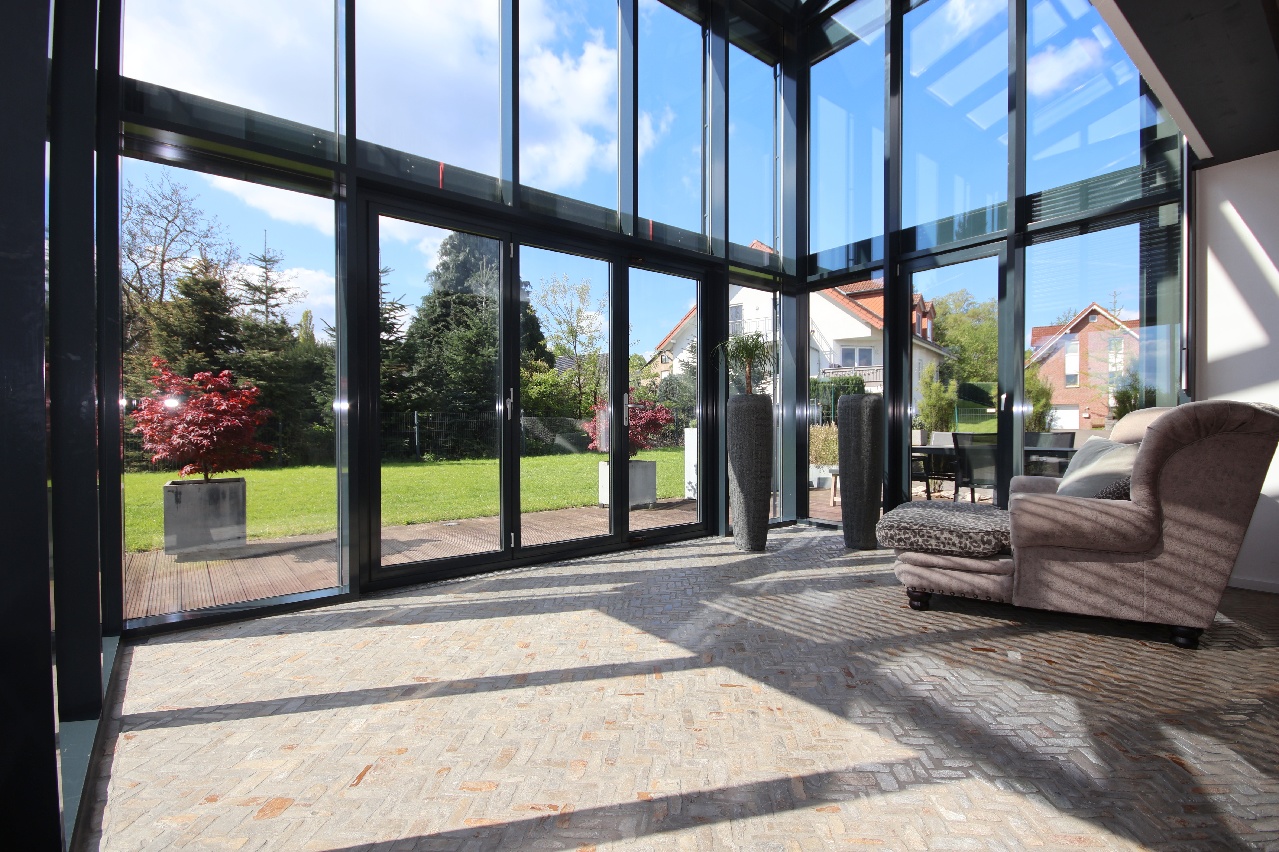Der mit Tudorfer Pflaster ausgestattete Boden verleiht dem Wintergarten zusätzlich eine besondere Note und unterstreicht das außergewöhnliche Wohnambiente mit doppelter Raumhöhe und Blick in den gepflegten Garten sowie auf die angrenzende Terrasse.