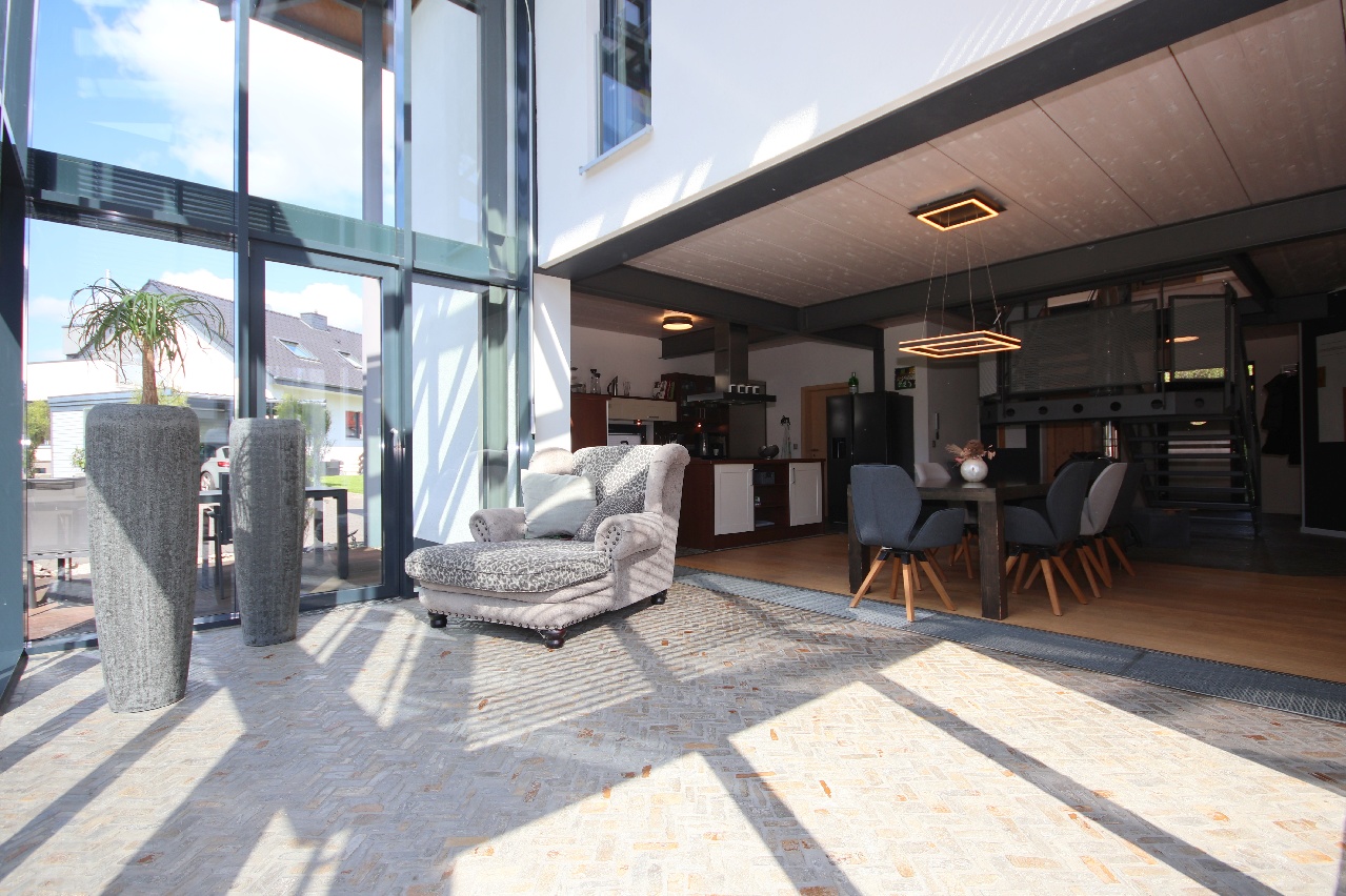 Ein besonderes Highlight ist der zweigeschossige Wintergarten mit offenem Luftraum, der sich über beide Etagen erstreckt und durch seine beeindruckende Glasfront für ein außergewöhnliches Raumgefühl sorgt.