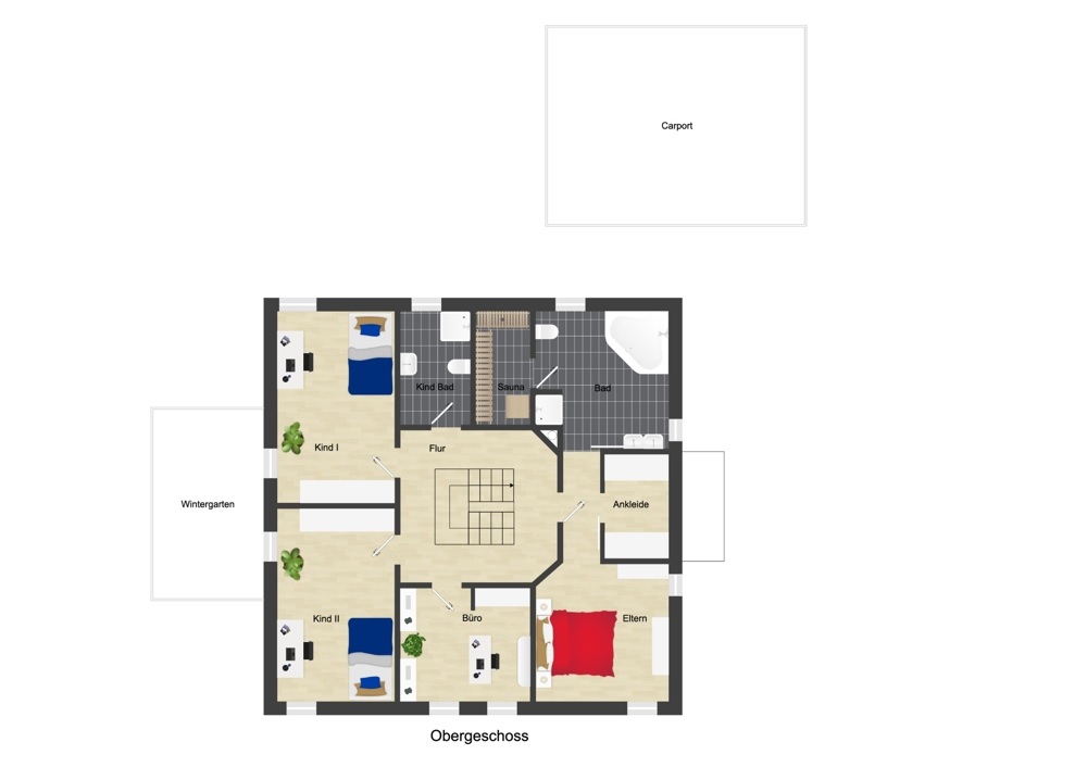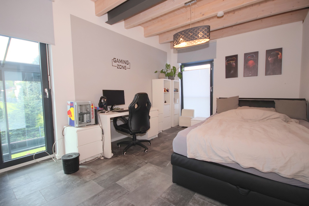 Im Obergeschoss wartet ein privater Elternbereich mit Schlafzimmer, separater Ankleide und einem komfortablen Badezimmer, das mit Badewanne, Dusche und einer eigenen Sauna ausgestattet ist.