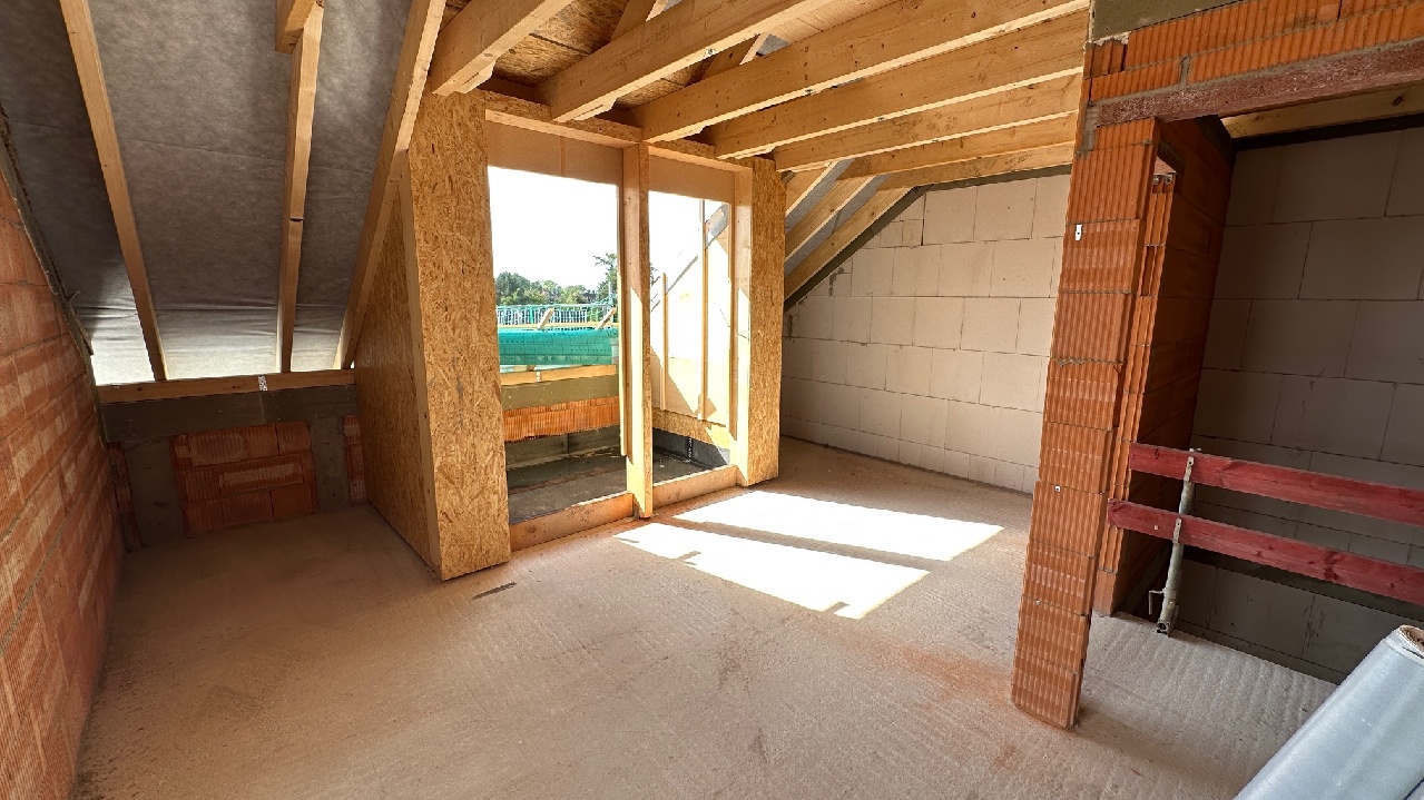 Das Dachgeschoss ist besonders vielseitig und bietet neben einem großen Wohnraumraum ein Arbeitszimmer, welches den Zugang zur Dach-Loggia ermöglicht und sich ideal für entspannte Stunden oder kreative Tätigkeiten eignet. Ein zusätzliches Badezimmer mit Dusche und Dachflächenfenster sorgt für viel Licht. Ein Abstellraum rundet das Dachgeschoss ab und bietet zusätzlichen Stauraum.