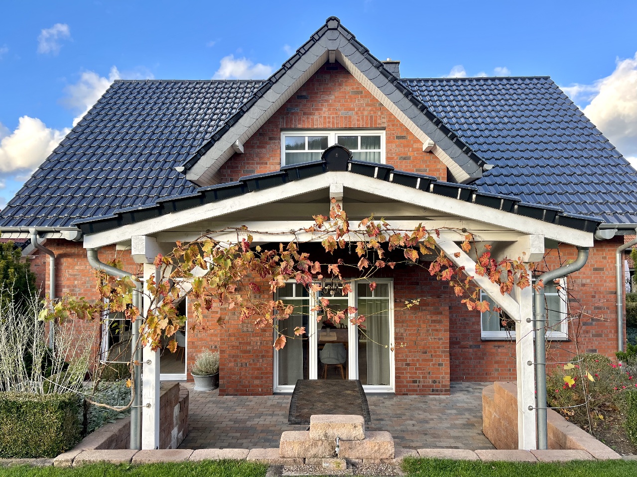 Neben der sonnigen überdachten Terrasse stehen Ihnen ein Gartengerätehaus, eine praktische